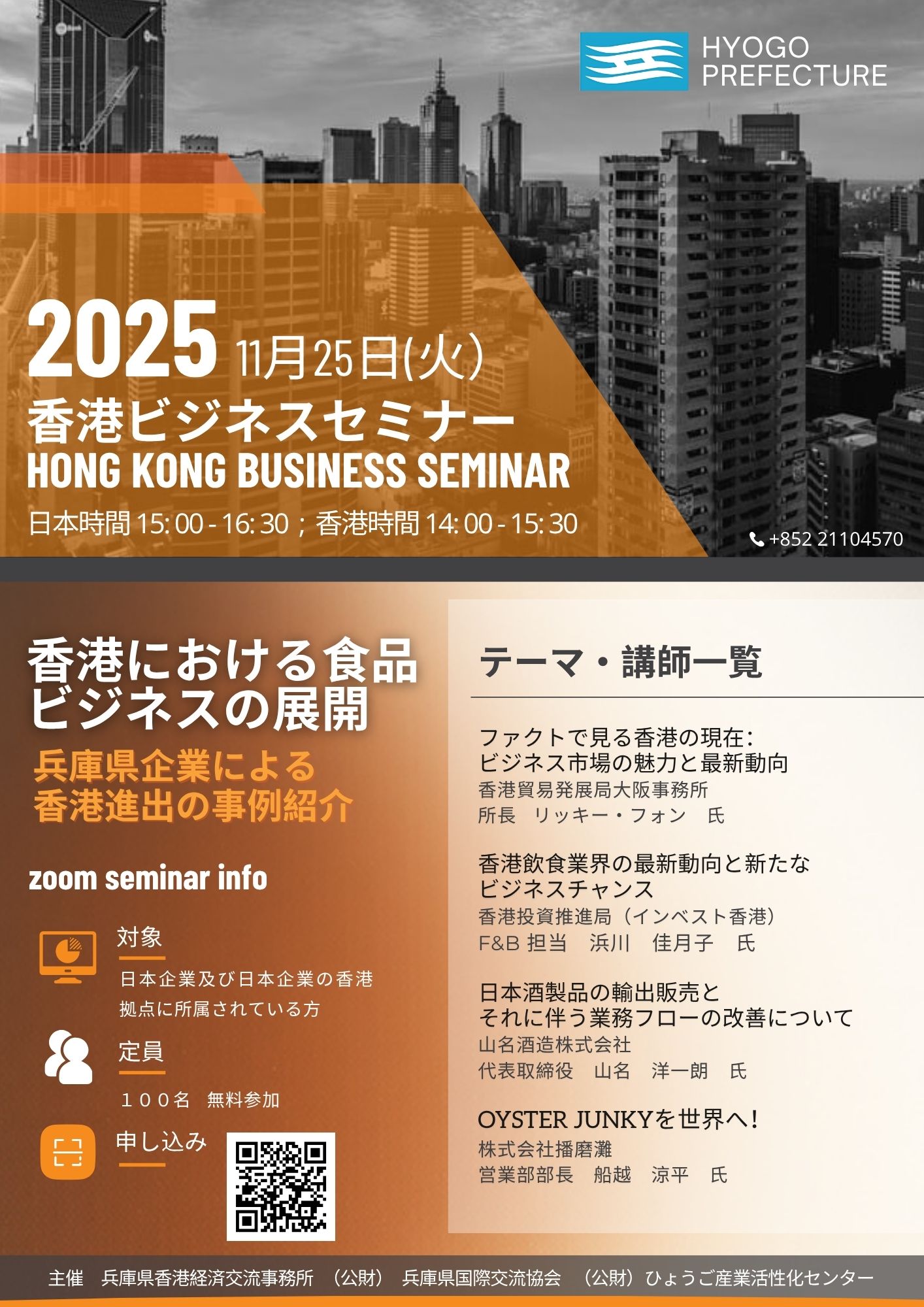 【定 員】100名(申込多数の場合は、香港兵庫県人会会員のほか兵庫県内に事業所のある企業・団体様を優先させていただく場合がございます。あらかじめご了承ください。)
